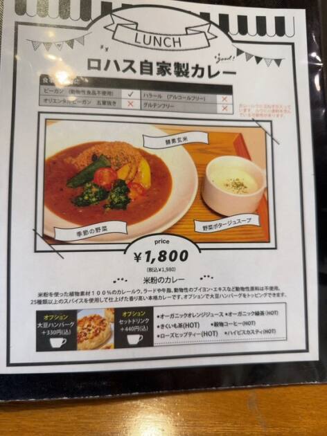 米粉を使用した植物素材100%のカレールウが使用されており、動物性原料は一切不使用となっている『ロハス自家製カレー』が美味しそうでした!