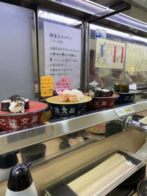 日によっておすすめのメニューが看板に書かれていて、レーンに流れているガラス瓶に食べたいネタを紙に書き瓶に入れる形式になっています!!