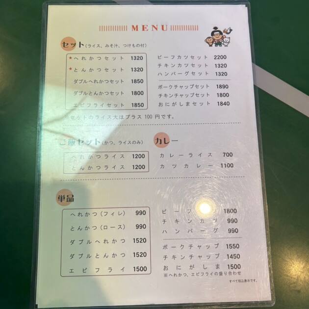 セット(ライス・味噌汁・つけもの付)は、「★へれかつセット」「★とんかつセット」「ダブルへれかつセット」「ダブルとんかつセット」「エビフライセット」「ビーフカツセット」「チキンカツセット」「ハンバーグセット」「ポークチャップセット」「おにがしまセット」