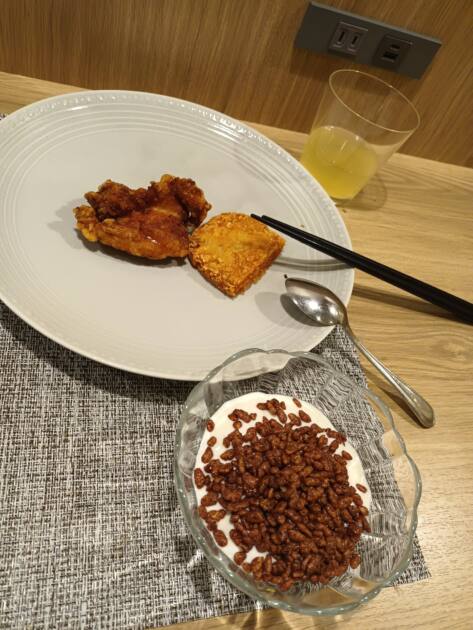 ザンギ(鶏の唐揚げ)、ハッシュドポテト、ヨーグルトにチョコフレークです。