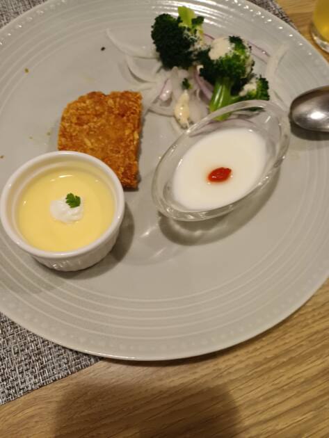 ハッシュドポテトにタマネギとブロッコリー(シーザードレッシング付)、プリンと杏仁豆腐です!