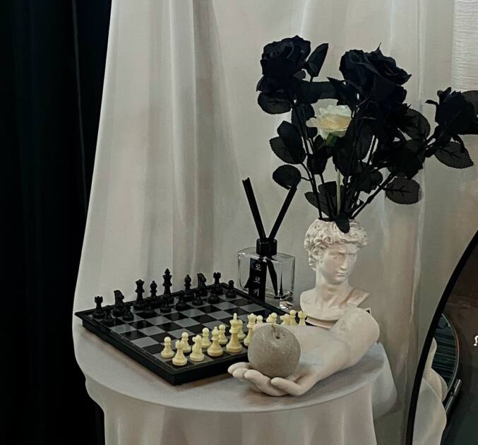 他にも黒色のドレッサーがあったり、机の上に置いてある一輪のバラをもって