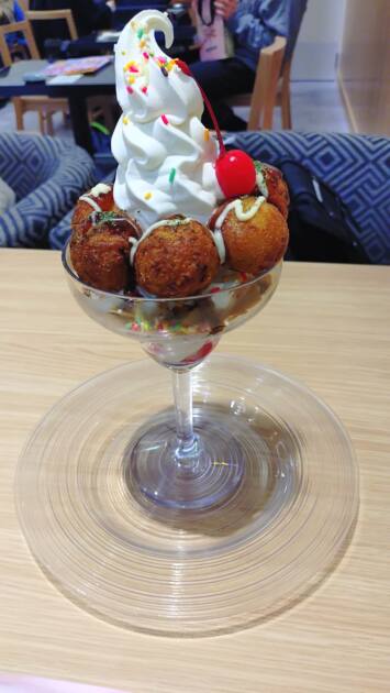 私が頼んだのは、たこ焼きパフェです🐙パフェというと、イチゴなどのフルーツを思い浮かべるのですが、ここのカフェでは、そういう一般的なパフェのほかに、焼きそばパンがのっているもの、エビフライ・唐揚げなど揚げ物がのっているものがあるなど、すごく変わったパフェがありどんな味なんだろうとメニュー見たときに思いました(´,,•﹏•,,`)💭