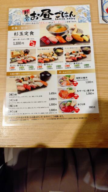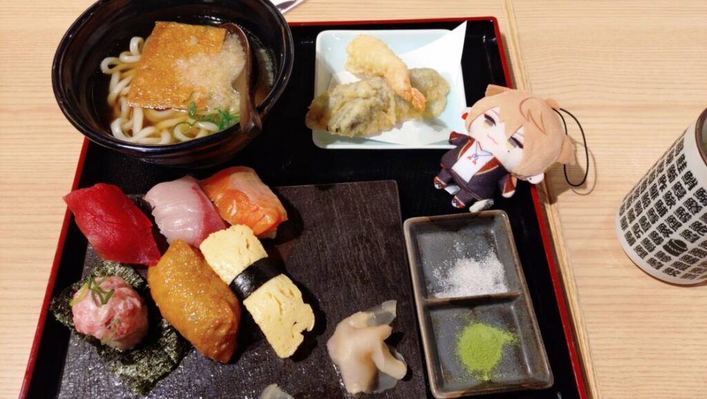 杉玉定食では、写真の通り、マグロ・ぶり・サーモン・ネギトロ・おいなりさん・たまごのお寿司とうどんに海老となすの天ぷらがありました✨