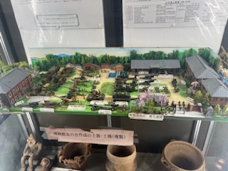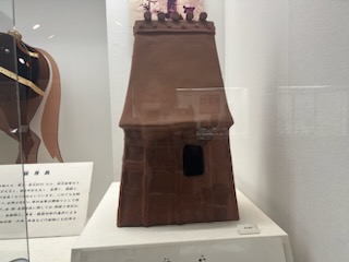 埴輪には、家形・人物・馬形・円筒などが出土されているそうです。埴輪はさまざまな器物や、人物、動物などを象徴していたそうです。写真のこちらの埴輪は、家形埴輪です。