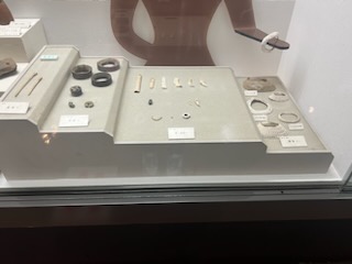 こちらは、縄文時代に使われていたそうです。身につける部位により、髪飾、耳飾、腕飾、頸〜胸飾、腰飾、足飾に区別されるそうです。素材は、石、粘土、牙、貝、木、竹が使われていたそうです。