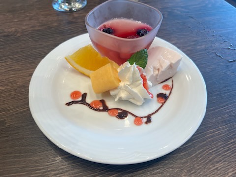 フルーツゼリーとオレンジ、生クリーム、プリン、パンナコッタと小さいながらもさまざまなデザートを食べることができました。盛り付けも、とても綺麗で、美味しかったです。