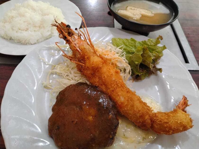 今回私が選んだのは、有頭エビフライとハンバーグの定食です。運ばれてきた瞬間、そのボリュームに驚きました!大きな有頭エビフライは、衣がサクサクで中はプリプリ。一口食べると、エビの旨味が口いっぱいに広がり、感動しました。ハンバーグも、肉汁たっぷりでジューシー。デミグラスソースとの相性も抜群で、ご飯がすすみます。