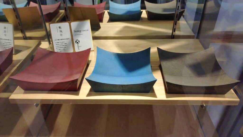 こちらは台座のような工作品でした。ただ、こちらの塗が新潟の漆器に見られる変わり塗りの技法の『朧銀塗』と呼ばれるもので、金属のような質感を持つ塗でした。