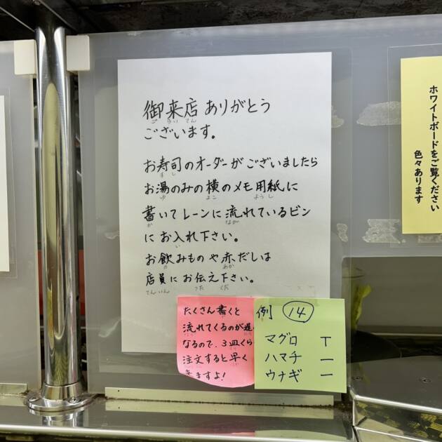 注文の際はレーンに流れている瓶にメモを入れて注文したネタは画像のように