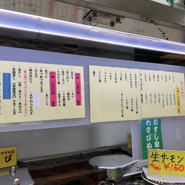 お寿司の種類もたくさんあり、120円~200円でメニュー外にも本日のおすすめなどが