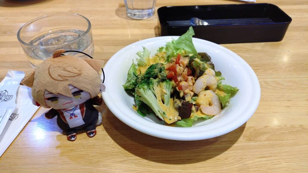 サラダは、ハーフサイズのエビとブロッコリーのサラダを食しました🍽️こちらはえびがぷりぷりしてて、食感が面白かったです!また、ドレッシングもコブドレッシングでまろやかな感じで、自分は聞いたことないドレッシングでしたが、とてもサラダにあっていました( •̀ ω •́ )✧