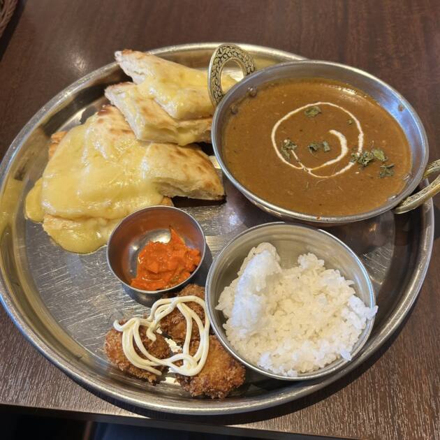 エビは5つ入っていてぷりぷりでチーズナンはチーズがプレートにあふれていてとてもお腹がいっぱいになり大満足でした❤