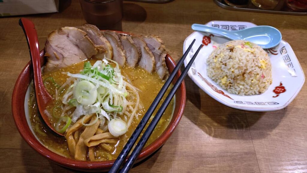 今回頼んだのは、このお店の定番らしい、もっけい味噌ラーメン チャーシュー増し(5枚)と半チャーハンでした🍜チャーシューは脂身もすごく、肉厚がすごかったです( •̀ ω •́ )✧味噌も、お店によっては辛いものだったりあるのですが、ここはそうでもなく味噌が濃厚でした😄半チャーハンは味薄目で、卓上にあるソースをつけて食べていました。ラーメンが濃い分、チャーハンは薄めにしてバランスをとっていたっぽいですが、個人的に濃い味がすきなので、すこしものたりなかったです・・・(´・ω・`)