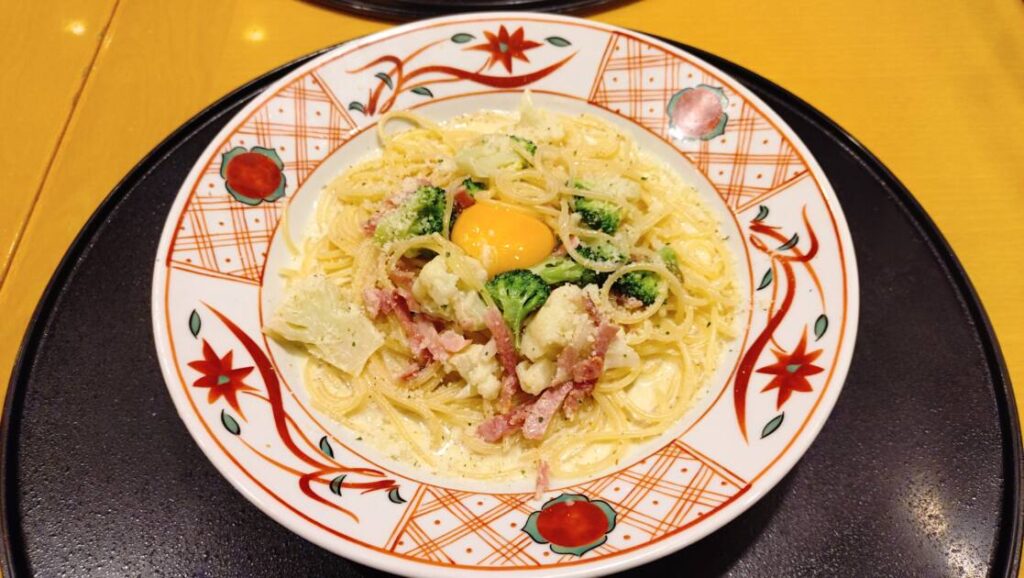 そしてメインのパスタが登場しまして、今回頼んだものはブロッコリーとカリフラワーのカルボナーラでした🍝パスタといえばスプーンとフォークで食べるのが一般的ですが、それらはなく、お箸でいただく形でパスタを食べている感じがしなかったです🥢麺はモチっとした感触でおなかにたまる感じでした🙌