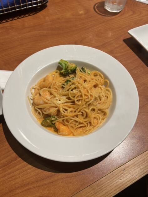 パスタは細麺で、海老はプリっとしていてブロッコリーに感触もありトマトクリームソースが