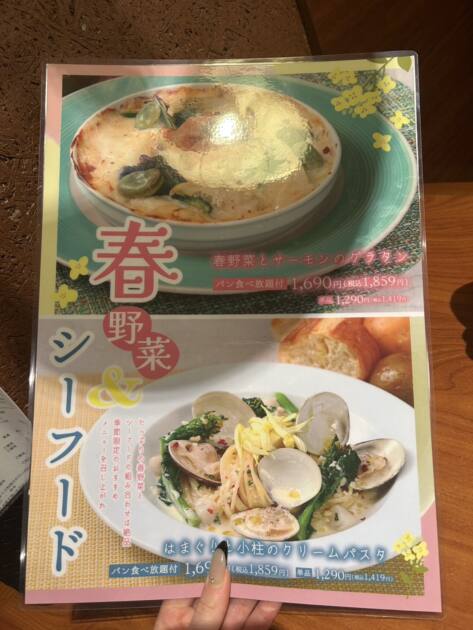 季節のメニューでは、春野菜とシーフードのドリアとパスタがありました!!