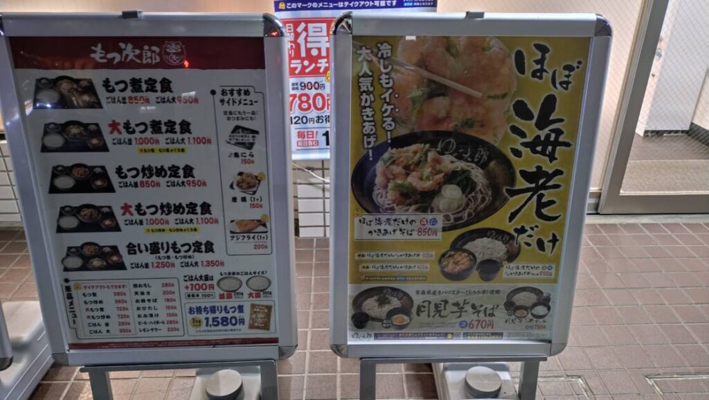 看板にメニューがすべて載っているのかなと思っていたのですが、それはもつ次郎というもつ煮定食のお店だけで、麺屋さんは季節限定のもののみ載せている感じでした。