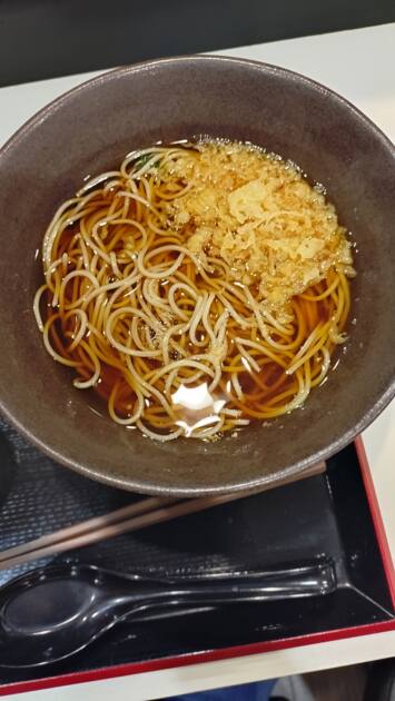 まずはそばなんですけど、細麺で麺の硬さは結構軟らかめになっておりました。また天かすを載せており、それでちょっと食感も変えられたため、飽きずにぺろりといけました(๑><๑)