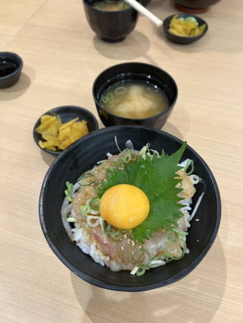 ホクホクで暖かいお米にユッケの少し甘いタレに漬けてある鯛を乗せてその上に卵が載っていました!!