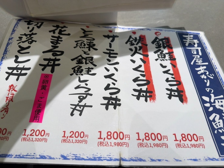 こちらは丼もののメニューなのですが、このほかに焼き魚定食、魚のフライ、単品のおつまみ系、お刺身などなど魚メニューがたくさんありました!