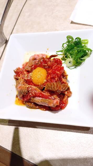 ユッケは少し表面を炙っている形かつ、少し辛めの味付けをしていました。