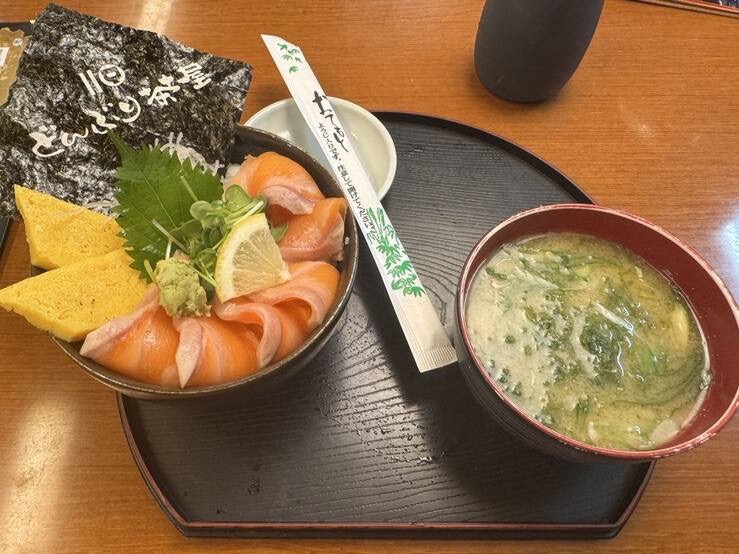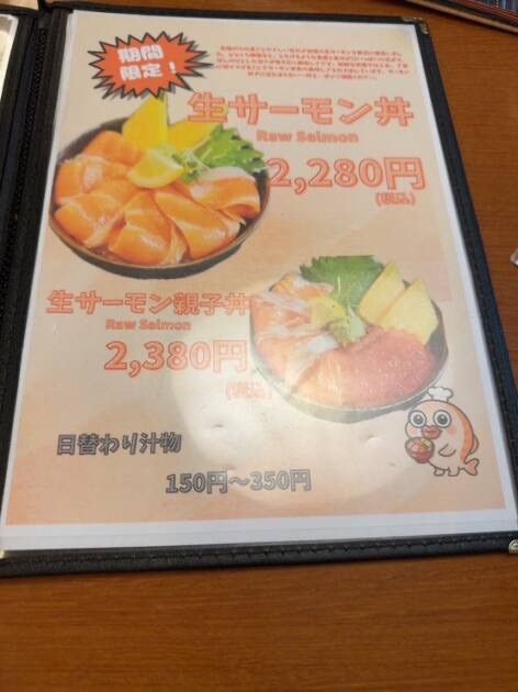 私はサーモンが大好きだったので迷わず『生サーモン丼』と本日の汁物で『あおさの味噌汁』を注文しました!