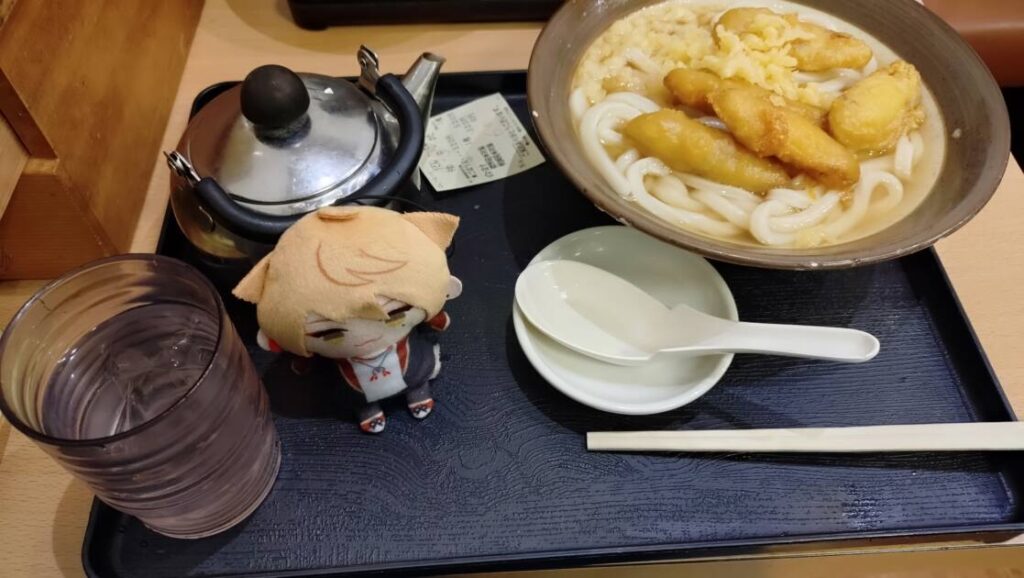 自分の頼んだものは、ごぼう天ののったうどんで、麺の硬さはやわめで頼みましたb