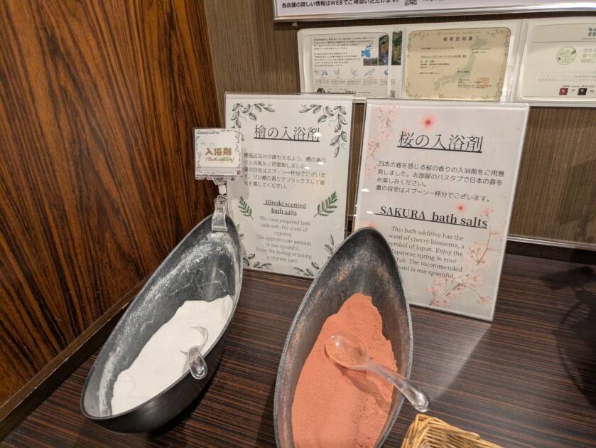 またアメニティとして入浴剤が置かれており、香りは檜と桜の2種類でした!これらは映っている透明なさじから手前にある袋に入れて部屋にもっていくことが出来ました!