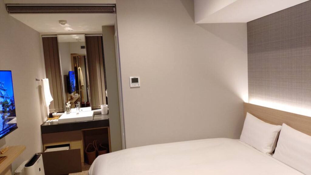 部屋はこのような感じで、壁掛けのテレビがあったり洗面台もすごくきれいでした。