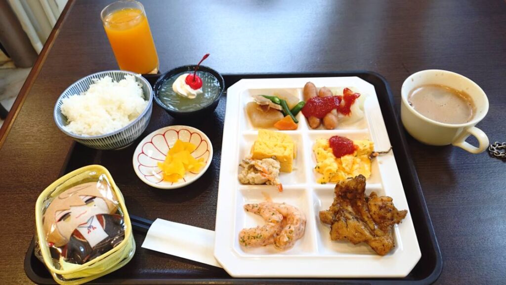 また朝食は、ビュッフェ形式で、ホテルでの朝食でよくあるもののほかに、エビマヨや山賊焼きがあり、わりとしっかり食べられるメニューでしたΨ(*¯ч¯*)そして、デザートのゼリーはリンゴ味でもので、その上にホイップクリームを絞りさくらんぼも乗っているというすこし贅沢なものになっており、ゼリー自体はあっさりに、かつ少しボリューミーに味わうことが出来ました!